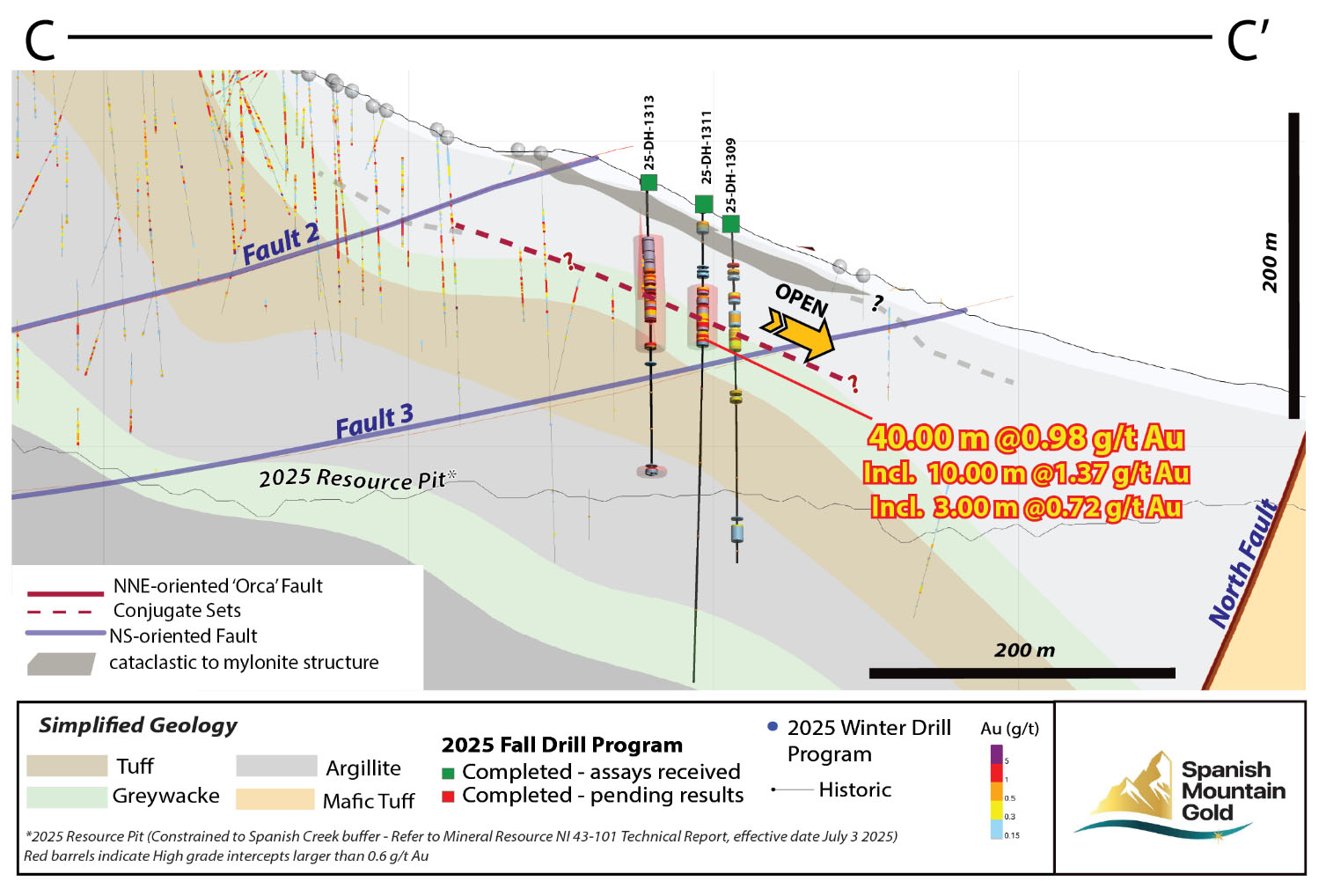 Six additional drill holes were collared and successfully completed (see Figure 4) in this southeastern extension area, 25-DH-1307 (Figure 1 and Table 1), 25-DH-1309 (Figure 1 and Table 2), 25-DH-1310 (Figure 2 and Table 3), 25-DH-1311 (Figure 3 and Table 4), 25-DH-1312 (Figure 2 and Table 5), and 25-DH-1313 (Figure 2 and Table 6). These drill holes, like 25-DH-1304 (see December 8, 2025, news release), hit narrower, but high-grade intervals of gold mineralization that extend the Orca Fault target over approximately a 500 m strike length. The results from these six new exploration drill holes in the southeastern extension of the Orca Fault target lend further confidence to the geological and structural interpretation of the new Orca Fault target area, especially when looking to the northwest and integrating with 25-DH-1281 and 25-DH-1282 (see April 21, 2025 news release), 25-DH-1292 and 25-DH-1293 (see November 3, 2025 news release), 25-DH-1294 and 25-DH-1296 (see November 17, 2025 news release), 25-DH-1297, 25-DH-1298, and 25-DH-1299 (see December 1, 2025 news release), and 25-DH-1300, 25-DH-1302, and 25-DH-1304 (see December 8, 2025 news release).