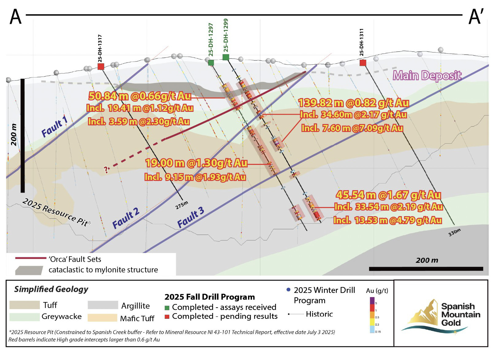 The results from these three new exploration drill holes compare very favorably with the results of 25-DH-1281 and 25-DH-1282 (see April 21, 2025 news release), 25-DH-1292 and 25-DH-1293 (see November 3, 2025 news release), and 25-DH-1294 and 25-DH-1296 (see November 17, 2025 news release), continuing to prove that tighter exploration drill spacing at the preferred azimuth of 120-degrees is key to unlocking additional mineral potential in the Main deposit. These exploration drill holes are presented on a drill section (Figure 1 and Figure 2) that shows the alignment of the higher-grade mineralization to the new Orca Fault target.