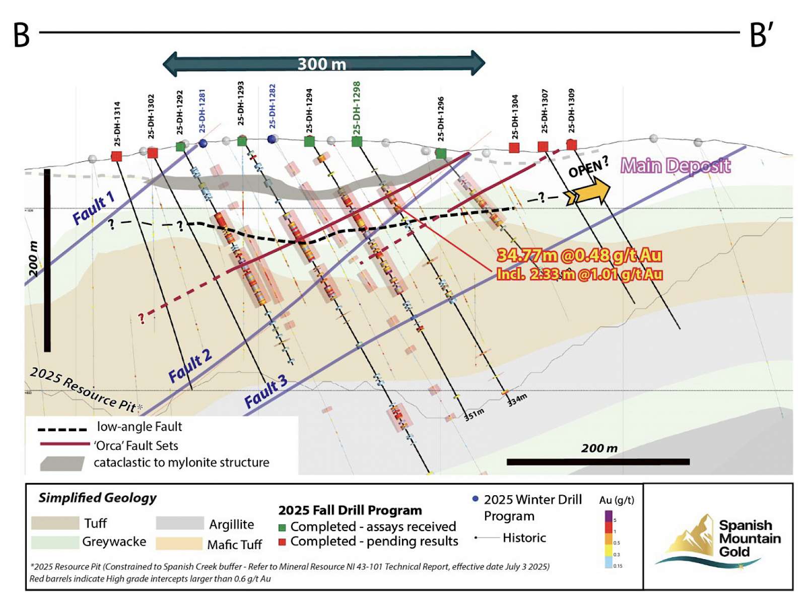 Drill hole 25-DH-1299 (see Table 3) was designed to confirm the new Orca Fault target and intersected higher-grade mineralization (Figure 1), approximately 75 m south of drill hole 25-DH-1294 (Figure 3), which is on the next drill section line immediately to the north. It should be noted that 25-DH-1299 has two key intersections, the first interval near surface from 48.18 to 188.00 m of 0.82 g/t gold over 139.82 m, including 34.60 m of 2.17 g/t gold with a subset of 7.60 m of 7.09 g/t gold. The second interval came near the base of constraining open pit shell for the 2025 Mineral Resource Estimate (see July 3, 2025 news release) from 284.00 to 329.54 m, grading 1.67 g/t gold over 45.54 m, including 33.54 m of 2.19 g/t gold with a subset of 13.53 m of 4.79 g/t gold. This deeper intercept highlights the mineral potential at depth that will require additional drilling to further delineate, but investors should be cautioned it is not guaranteed that additional drilling will result in conversion of this area into the mineral resource estimate.