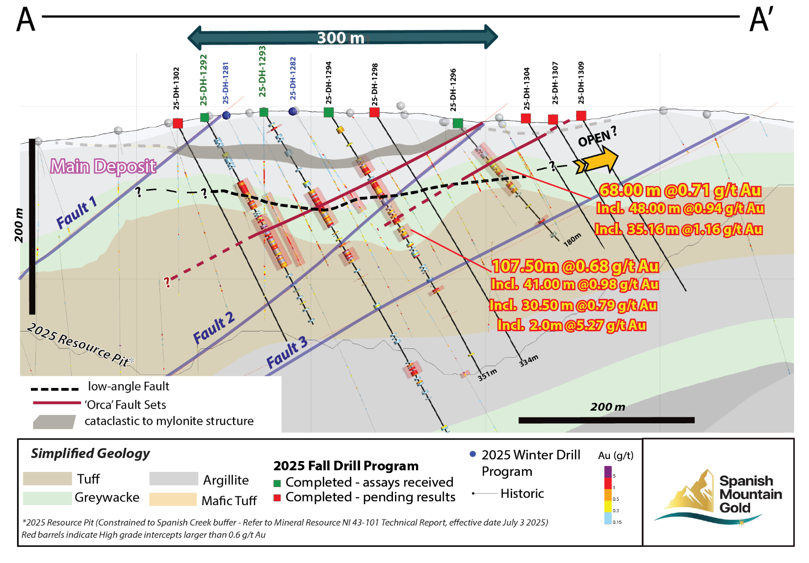 Drill hole 25-DH-1294 (see Table 1) was designed to confirm the new Orca Fault target and intersected higher-grade mineralization, approximately 70 metres southeast of drill hole 25-DH-1293 (see Figure 1), which intersected 102.00 metres of 0.64 g/t gold from 94.00 to 196.00 metres, including 20.25 metres of 1.28 g/t gold with a subset of 2.36 metres of 2.15 g/t gold (see November 3, 2025 news release). Drill hole 25-DH-1294 intersected a wide interval of mineralization from 64.00 to 171.50 metres grading 0.68 g/t gold that included 41.00 metres of 0.98 g/t gold. Drill hole 25-DH-1296 (Table 2) was similarly designed at 150 metres southeast from 25-DH-1294 and it also successfully intersected higher-grade mineralization, 68 metres grading 0.71 g/t gold, including 48.00 metres of 0.94 g/t gold with a subset of 35.16 metres of 1.16 g/t gold.