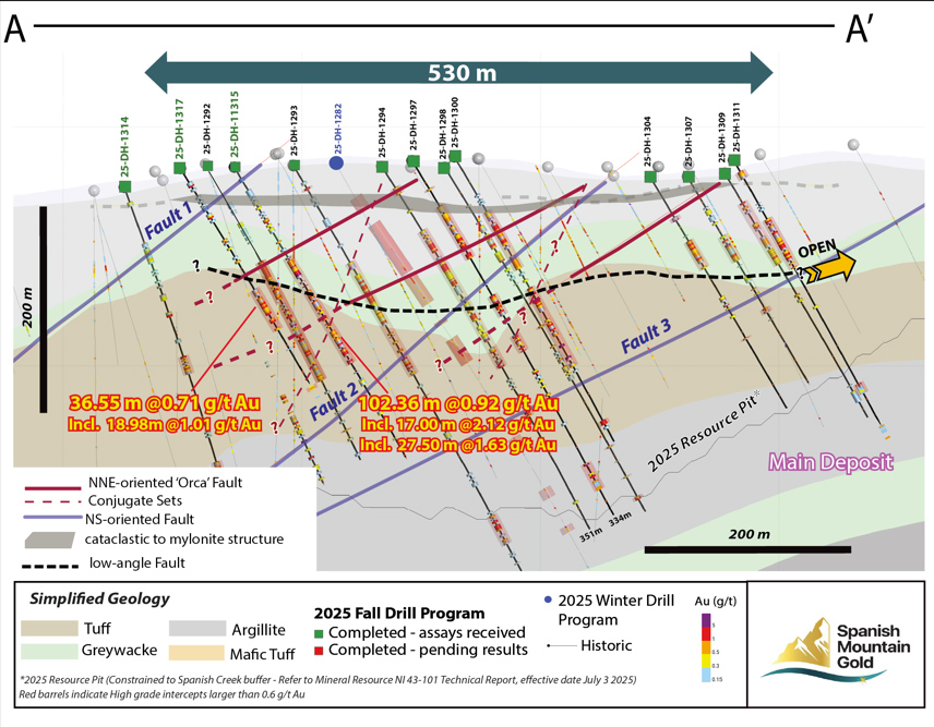 Five (5) additional drill holes were collared and successfully completed (see Figure 3) in the Orca Fault target area, 25-DH-1314 (Figure 1 and Table 1), 25-DH-1315 (Figure 1 and Table 2), 25-DH-1316 (Figure 2 and Table 3), 25-DH-1317 (Figure 1 and Table 4), and 25-DH-1318 (Figure 2 and Table 5). These drill holes continue to confirm and lend confidence to the extent of the Orca Fault target over 530 m strike length and its geological and structural interpretation within the constraining open pit for the MRE (see July 3, 2025 news release).
