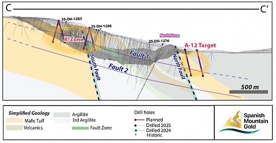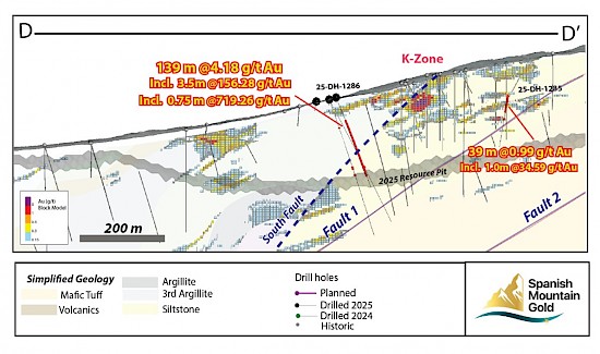 The K-zone, which is located in the southwest portion of the Main deposit will be a high priority target in the planned drill program. Drill hole 25-DH-1286 intersected 139.00 metres grading 4.18 g/t gold, including 0.75 metres grading 719.26 g/t gold in the winter 2025 drill program (see April 24, 2025 news release). This intercept is the highest recorded on the SMG Project and step-out drill holes in the upcoming program will look to further develop information on the orientation and extent of these important near-surface, high-grade vein structures. It is important to note that all winter 2025 drill holes from K-zone were not included in the 2025 MRE, and therefore, the high-grade intercept had no impact on the block model.