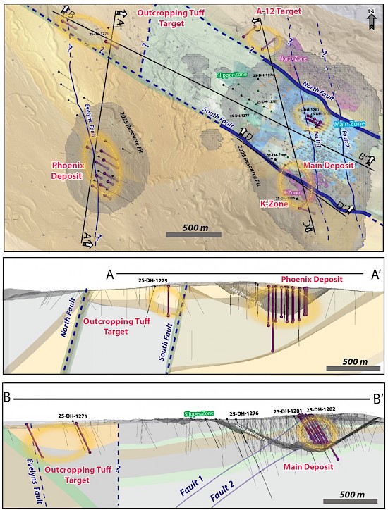 The Phoenix deposit was the focus of drill programs in 2024 and 2025, which outlined a large, near-surface gold endowment in its inaugural MRE (see July 3, 2025 news release). Drilling in the upcoming program will be focused along the main north-northwest trending Evelyn Fault that transects most of the favorable, mineralized trend over a distance of 1.4 km and has yield higher-grade gold results such as drill hole 25-CCR-062, which intersected 62.00 metres grading 1.47 g/t gold, including 4.00 metres grading 17.28 g/t gold (see June 2, 2025 news release). Other notable intercepts at the Phoenix deposit include drill hole 25-CCR-056, which intersected 116 metres, grading 0.40 g/t, including 13.12 metres, grading 1.27 g/t gold (see June 2, 2025 news release).