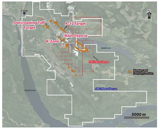 The A12 target is located along strike and west of the Main deposit MRE and is coincident with a strong gold-in-soil and geophysical anomaly. Drill holes in the upcoming program are primarily condemnation holes to derisk the surface infrastructure footprint for the process plant and dry stack tailings management facility as identified in the 2025 PEA. However, the favorable soil geochemistry and geophysics immediately west of the open pit may be associated with extensions to the Main deposit and provide a near-open pit opportunity that could have a significant positive impact to the SMG Project.